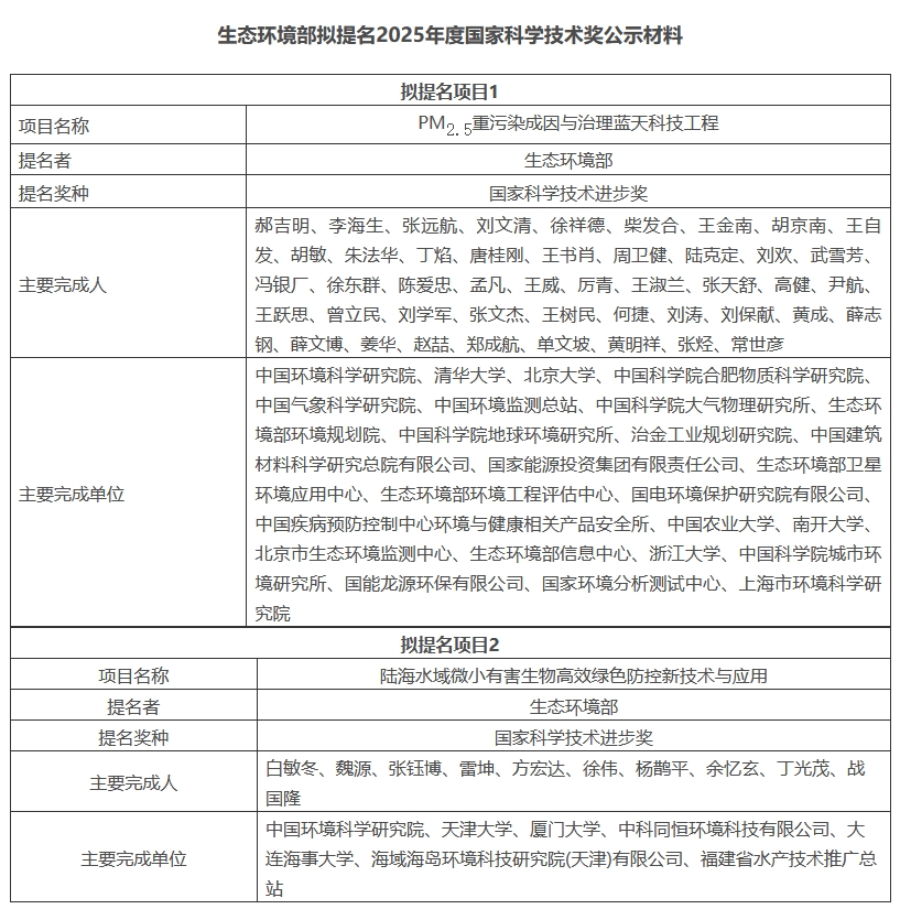 發(fā)表時間:2025-06-30 15:03 瀏覽次數(shù):703 〖返回〗6月12日,生態(tài)環(huán)境部發(fā)布關(guān)于擬提名2025年度國家科學技術(shù)獎的公示。詳情如下: